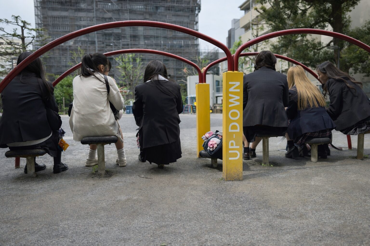 赤い輪のついた「UP-DOWN」のベンチに、みんなきれいに背中を並べて座る。