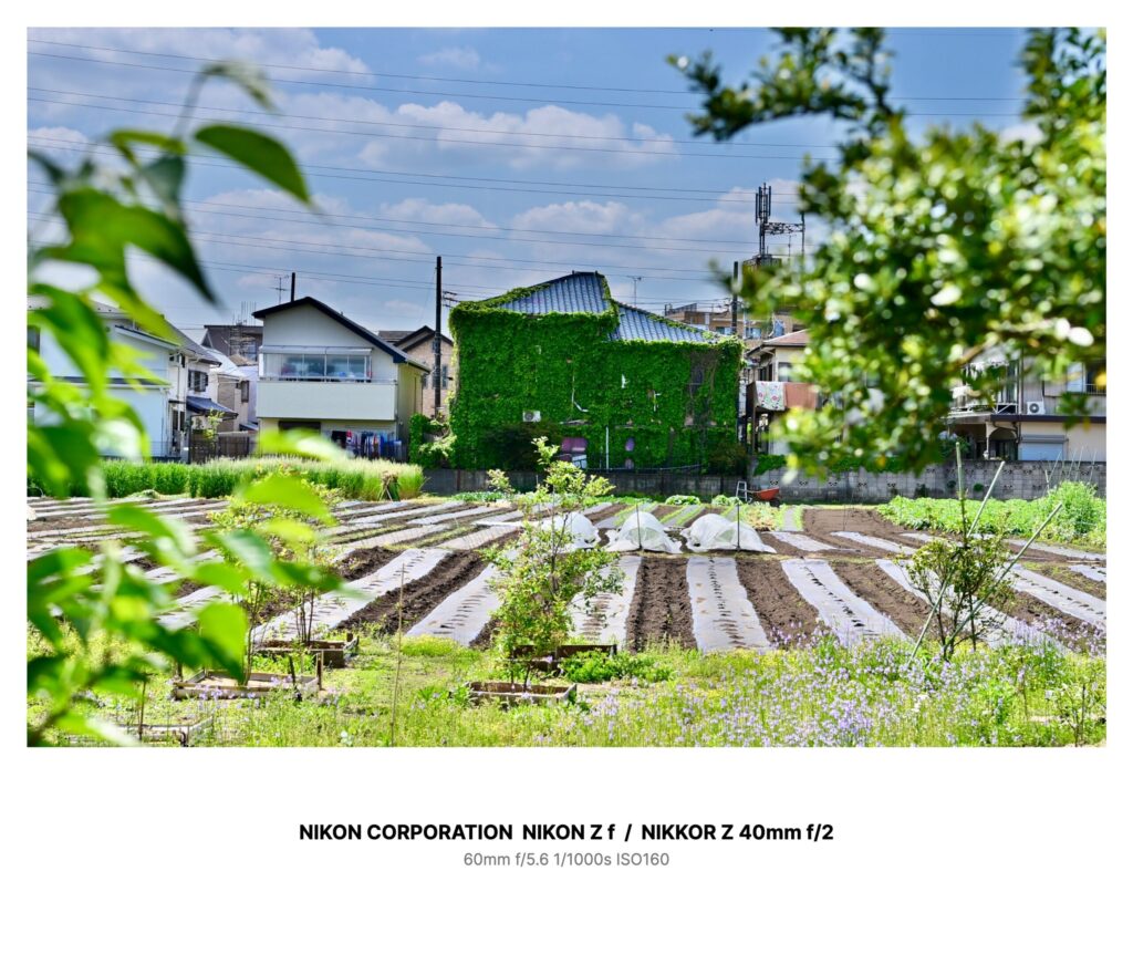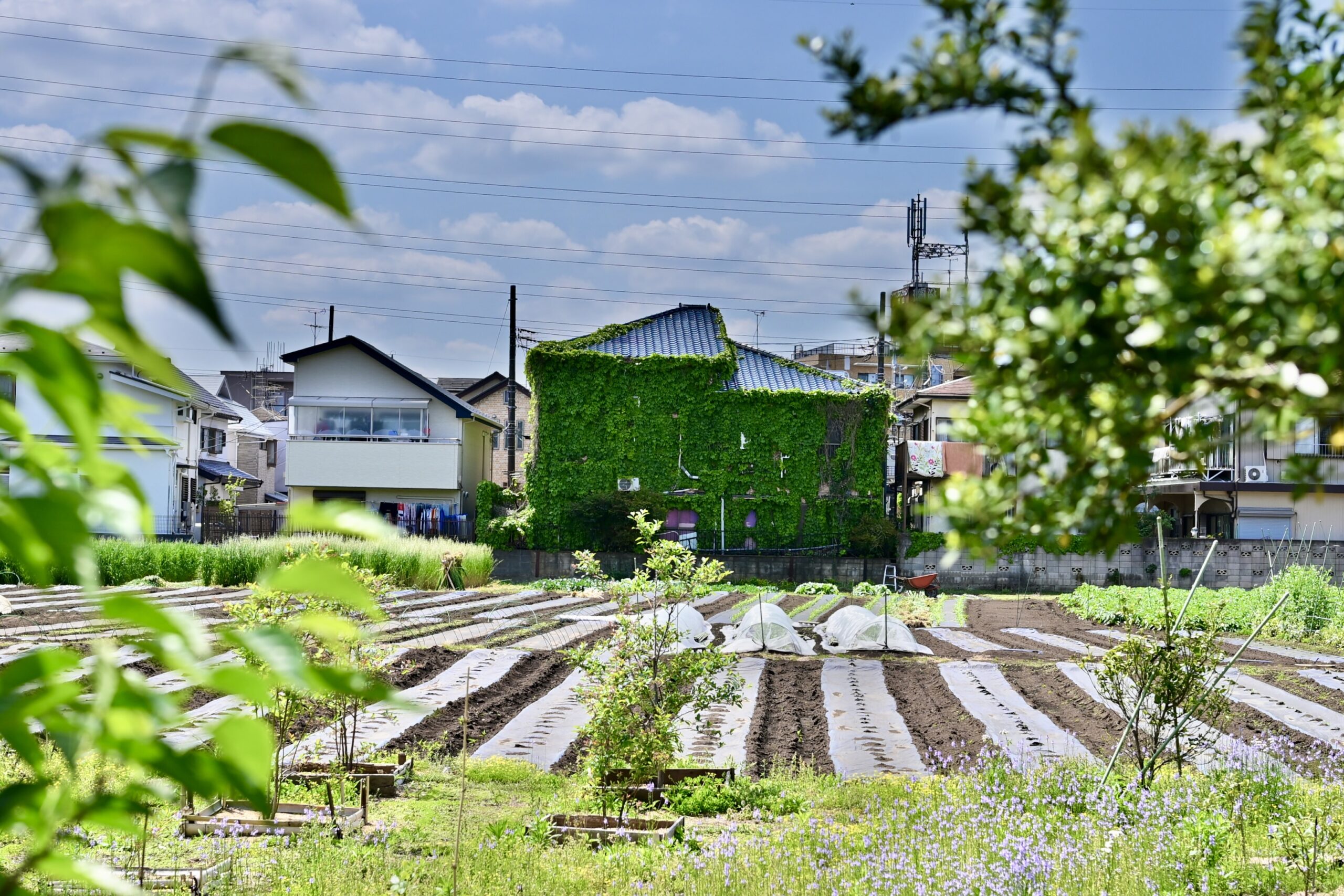 その貸し畑の向こうには、古い住宅が一軒立っている。壁の大部分を濃い緑の蔦に覆われ、青い瓦屋根だけが春の終わりの光を鈍く返していた。手前には野菜を植える畝が何列も並び、その上には白いビニールがところどころかぶせられている。