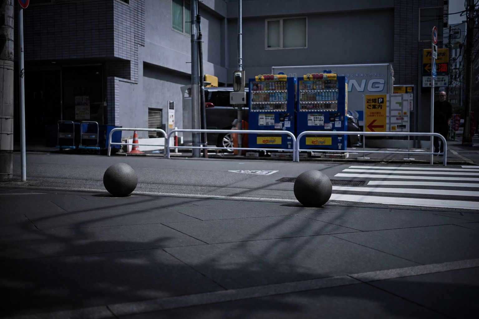 その交差点には、横断歩道の手前に黒ずんだ球形の車止めが二つ置かれていて、近くのビルでは「抜けてはいけない隙間」と呼ばれていた。横断歩道へ出るにはそこを通るのが近道なのに、清掃の人たちは必ず白いガードパイプ側へ回る。理由を聞くと、後ろの自販機が勝手に返すからだと言う。