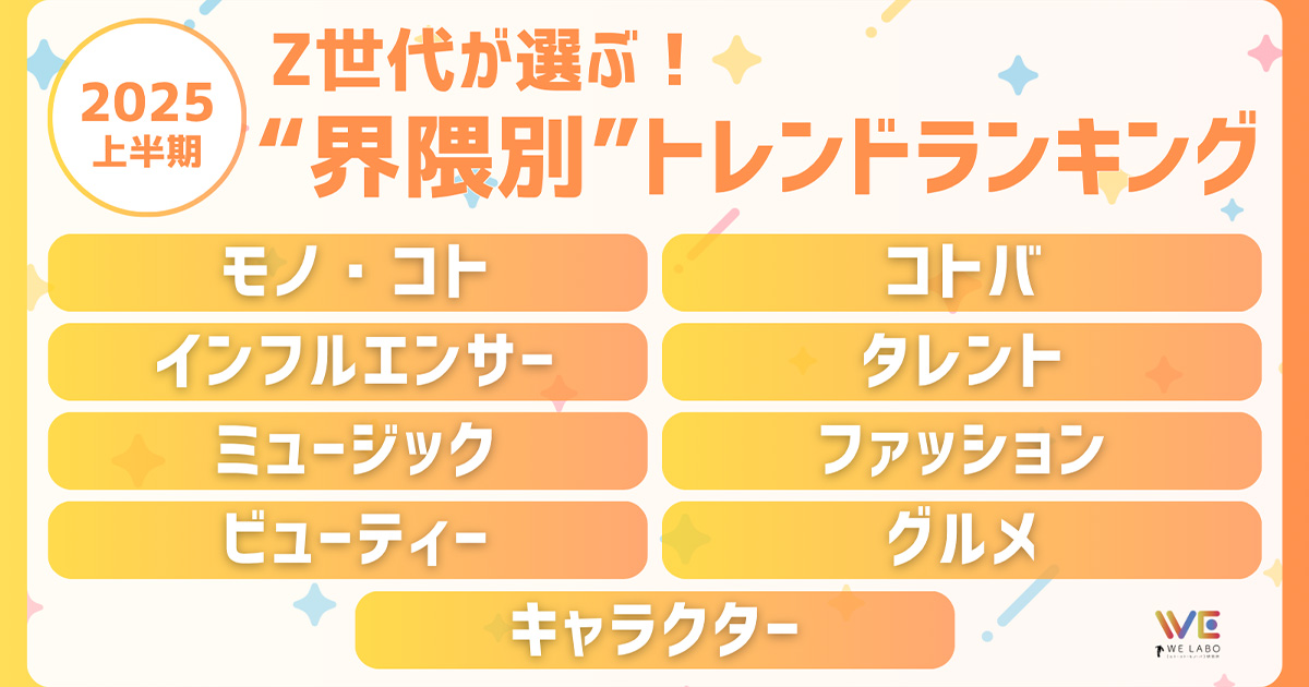 2025年上半期Z世代トレンドを“界隈”ごとに発表 “森ガール”リバイバルや「フィー」がランクイン - WWDJAPANウィゴーが運営する[ヒト・コト・モノ・バ]研究所は、2025年上半期のトレンド9部門を、総フォロワー数57万人を超える8つの“界隈”ごとに分けてランキング形式で発表した。界隈は、“JK”“二次元オタク”“三次元オタク”“韓国”“ダンサー”“地雷”“Y2K”“ガーリー”に分類し、総計12万を超える回答を集計した。