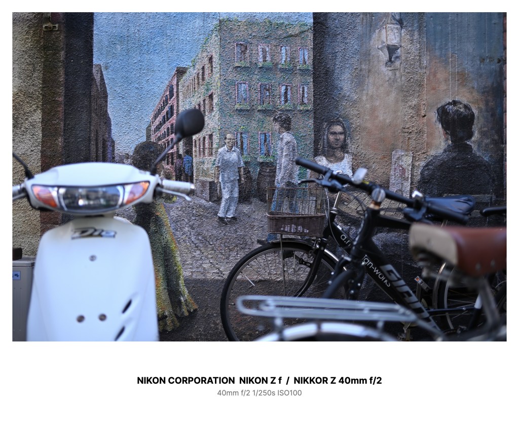 商店街の裏路地、壁一面に描かれた西洋の街並みの絵。
