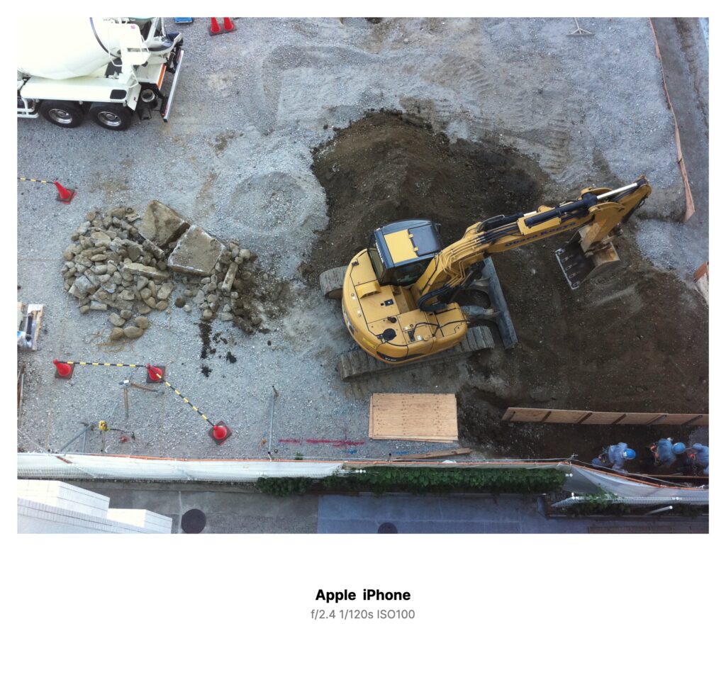 工事現場のショベルカーが、ゴウンと音を立てて土をすくい上げていた。