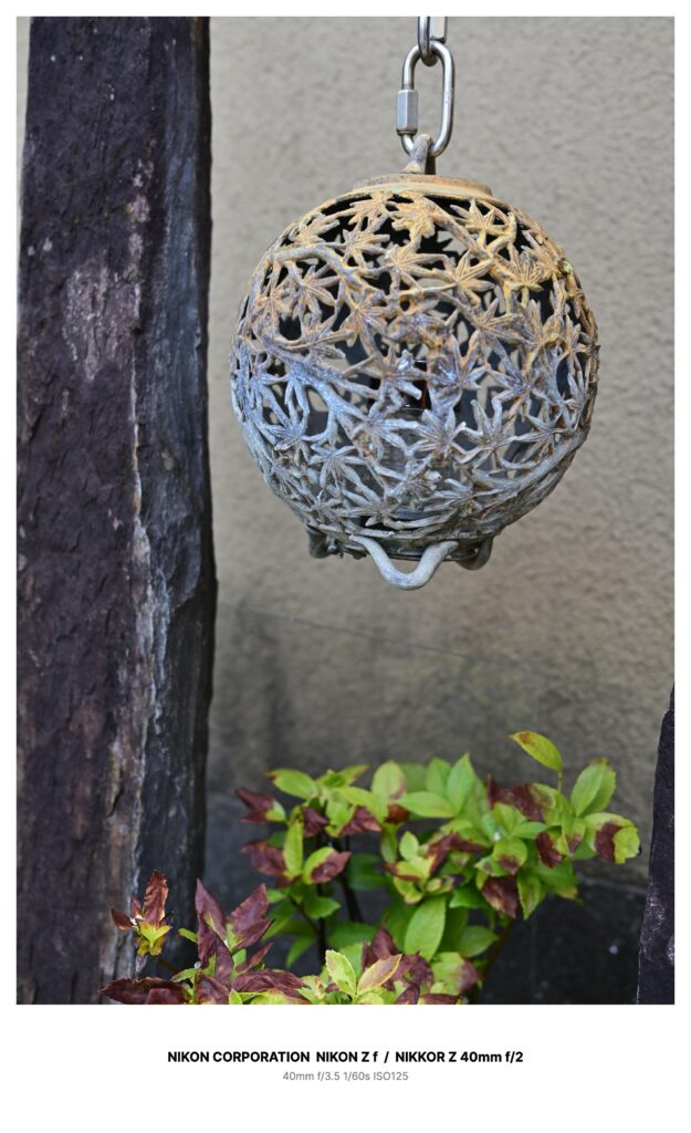 庭の片隅に吊るされた、錆びの浮いた透かし彫りの鉄籠。