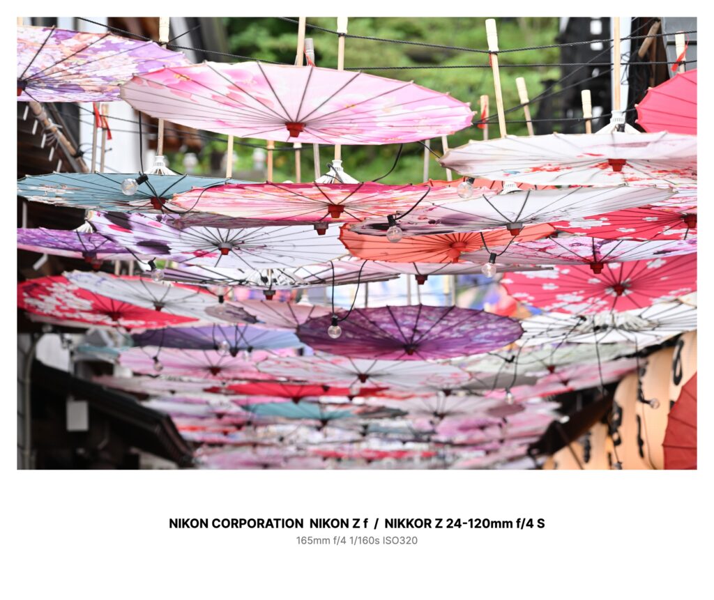 商店街の細い路地を歩くと、頭上に無数の和傘が吊るされていた。赤や桃色、薄紫の布地が重なり、光を柔らかく遮っている。まるで花の海に潜っていくようで、訪れる人々は皆、思わず足を止めて見上げるという。