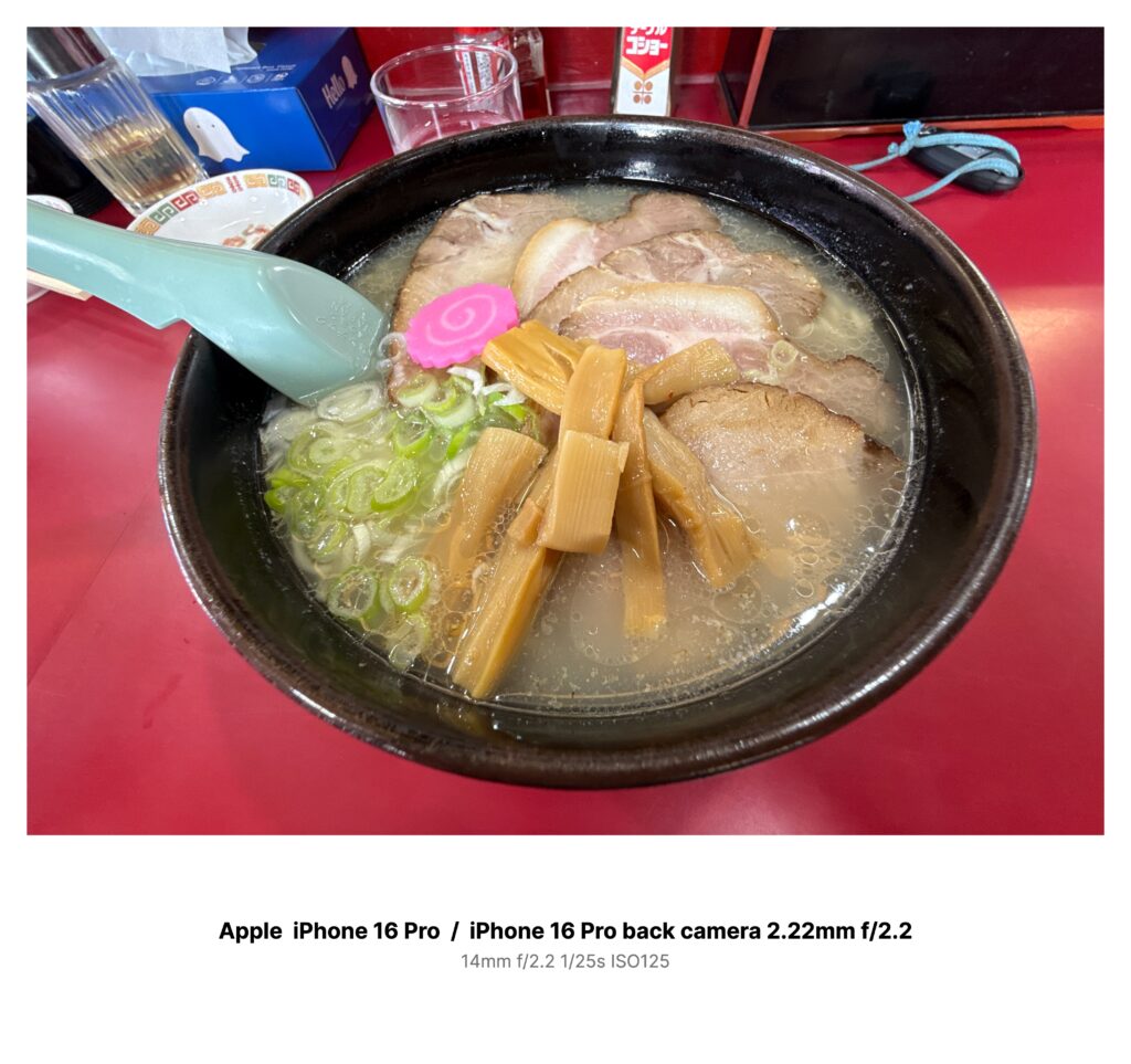 昼下がり、赤いカウンターに置かれたラーメン。