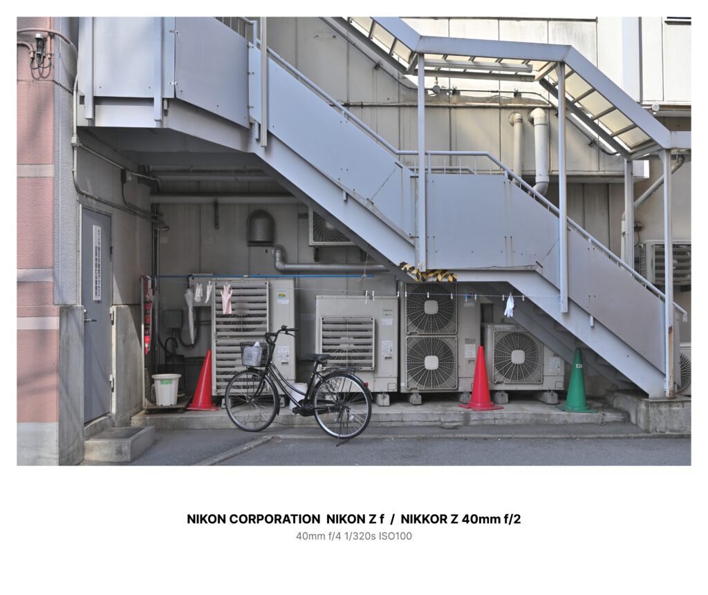 雑居ビルの裏手。昼間はただの退屈な景色──自転車、カラーコーン、並んだ室外機。